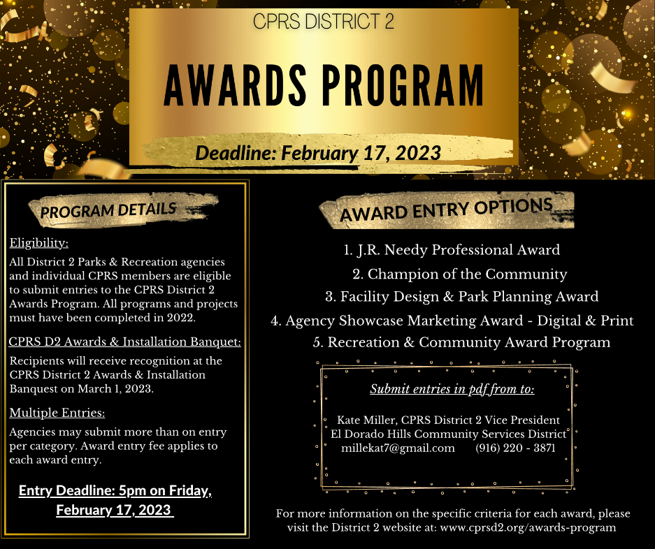 District 2 is your local connect to the California Park & Recreation Society. It is the largest geographic district serving the following counties: Alpine, Amador, Butte, Colusa, El Dorado, Glenn, Lassen, Modoc, Nevada, Placer, Plumas, Sacramento, Shasta, Sierra, Siskiyou, Sutter, Tehama, Yolo and Yuba. With more then 60 park & recreation agencies in District 2 we are dedicated to enhancing the park & recreation profession in our district.