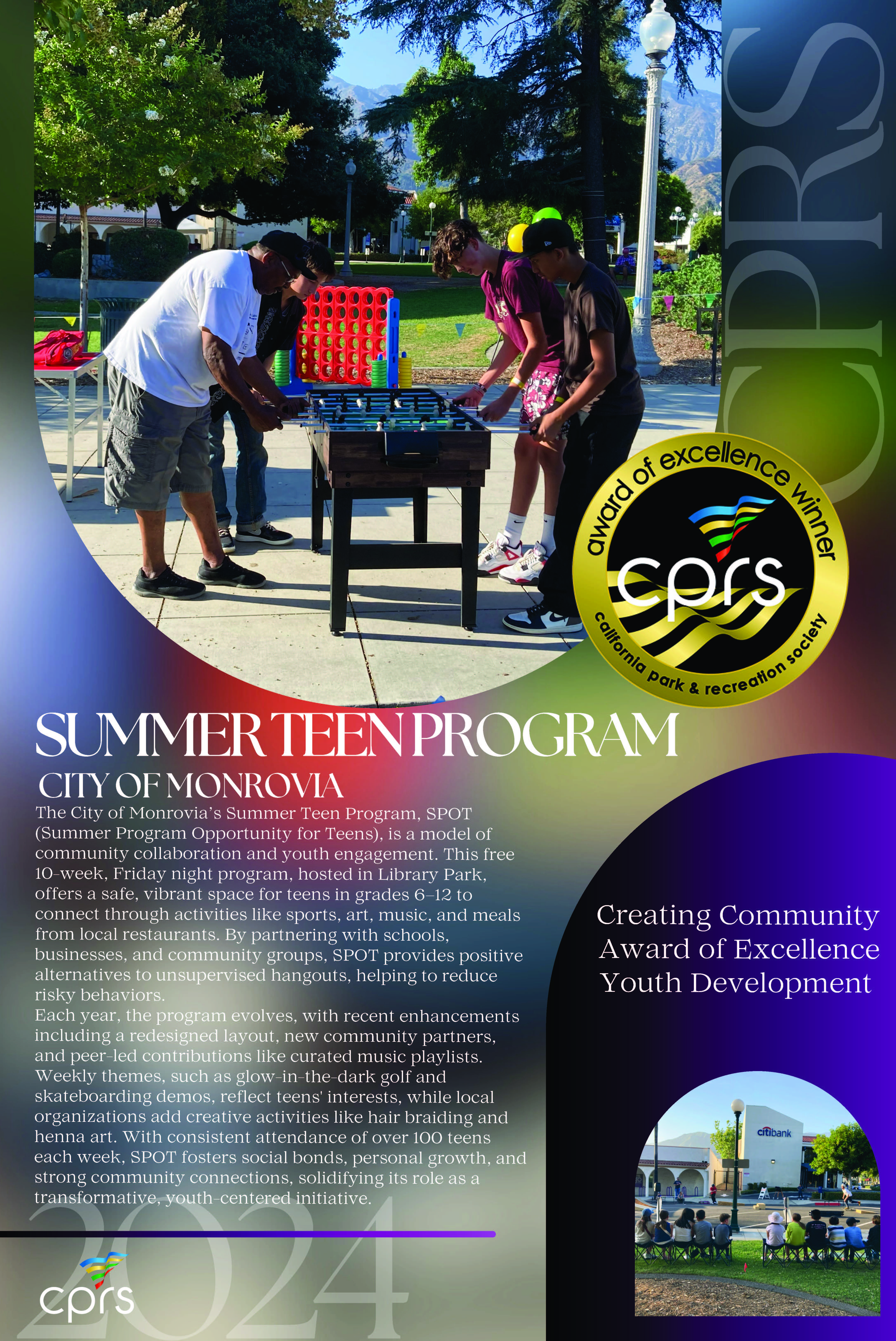 The City of Monrovia’s Summer Teen Program, SPOT (Summer Program Opportunity for Teens), is a model of community collaboration and youth engagement. This free 10-week, Friday night program, hosted in Library Park, offers a safe, vibrant space for teens in grades 6–12 to connect through activities like sports, art, music, and meals from local restaurants. By partnering with schools, businesses, and community groups, SPOT provides positive alternatives to unsupervised hangouts, helping to reduce risky behaviors. Each year, the program evolves, with recent enhancements including a redesigned layout, new community partners, and peer-led contributions like curated music playlists. Weekly themes, such as glow-in-the-dark golf and skateboarding demos, reflect teens' interests, while local organizations add creative activities like hair braiding and henna art. With consistent attendance of over 100 teens each week, SPOT fosters social bonds, personal growth, and strong community connections, solidifying its role as a transformative, youth-centered initiative.