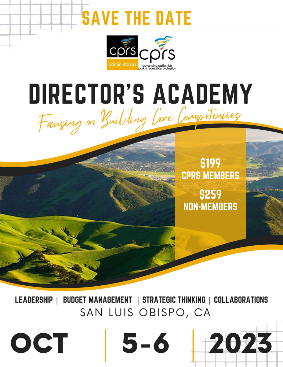 Save the date for the CPRS Administrators Section Director's Academy on October 5 & 6, 2023 in San Luis Obispo. Stay tuned for more information and registration link.