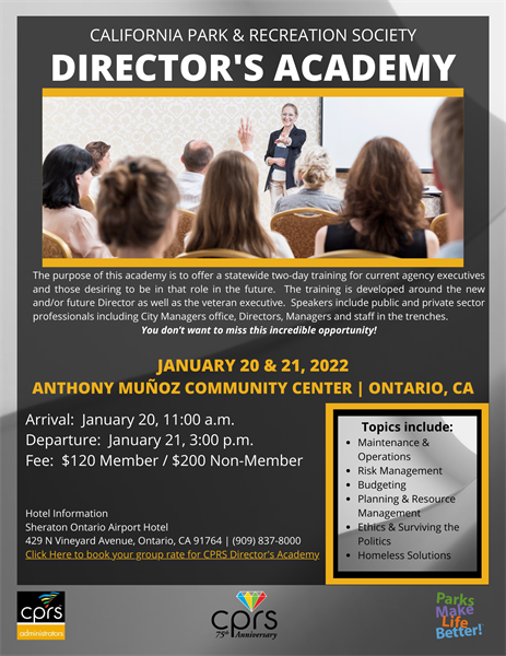 The Director's Academy will be held on January 20-21, 2022 in Ontario, CA. The purpose of this academy is to offer a statewide two-day training for current agency executives and those desiring to be in that role in the future. The training is developed around the new and/or future Director as well as the veteran executive. Speakers include public and private sector professionals including City Managers office, Directors, Managers and staff in the trenches.