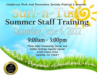 Main takeaway: REGISTER your summer staff for SURF N TURF our award-winning summer staff training being held on Saturday, June 4, 2022, from 9:00 a.m. to 3:00 p.m. in Vacaville.