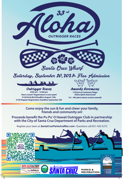 We are just a few weeks away from the 33rd Annual Aloha Outrigger Races on the Santa Cruz Wharf. The races will be on September 20th. We still have spots left for teams, men's, women's and coed. Don't have a team of 4, you can get on our free agent list. Boats and professional steersmen provided so you do not have to be an expert to make a team. See details below.