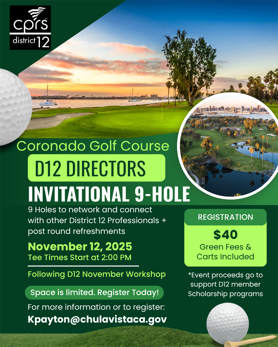 Join us following the D12 November Workshop on Wednesday, November 12th, 2025 for the D12 Directors Invitational 9-Hole! This is a great opportunity to network and connect with other District 12 Professionals + post round refreshments.