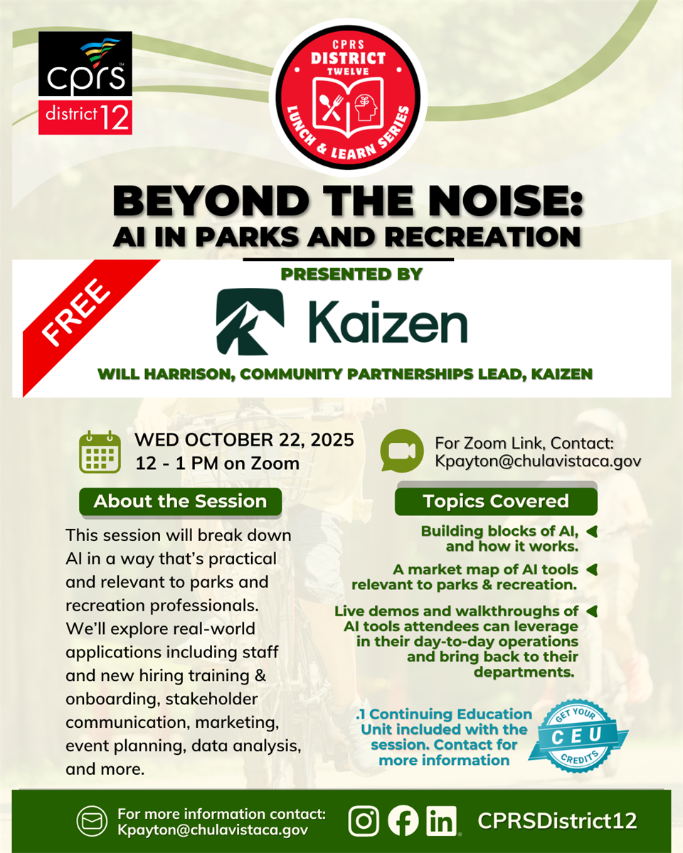 Kaizen presents, "Beyond the Noise: AI in Parks and Recreation" on Wednesday, October 22nd 2025 from 12-1pm via Zoom.