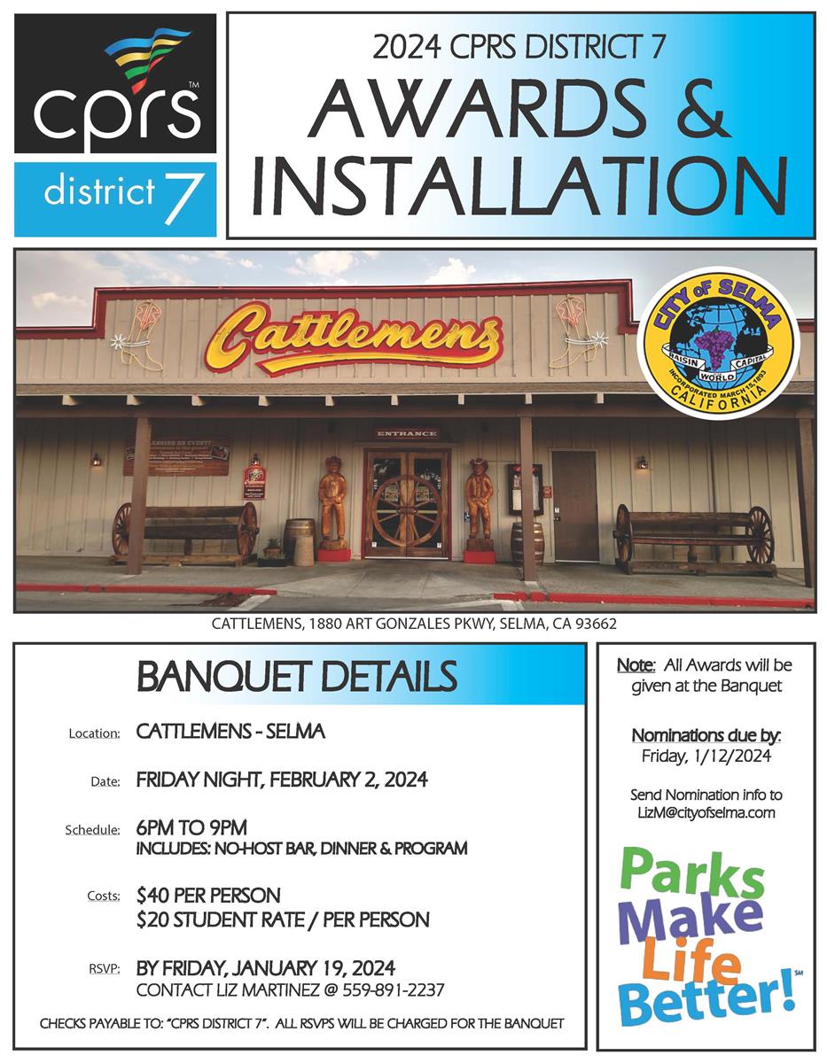 The 2024 Awards & Installation Banquet will occur on Friday, February 2, 2024, at 6:00 p.m. at the CATTLEMENS in Selma, CA.