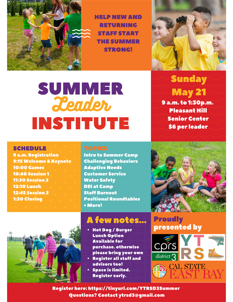 D3 Board and YTRS are putting on the District 3 Summer Camp Leader Institute on Sunday May 21st in Pleasant Hill from 9:00 AM - 1:30 PM. Over 10 agencies are already registered with over 100 Summer Camp Leaders combined, and we have room for about 40 more Summer Camp Staff to join us! Are you looking for help with your summer staff training, or looking to take some of the stress off your own in-house training? Register today! Space is limited. Link is below. $6.00 per person.