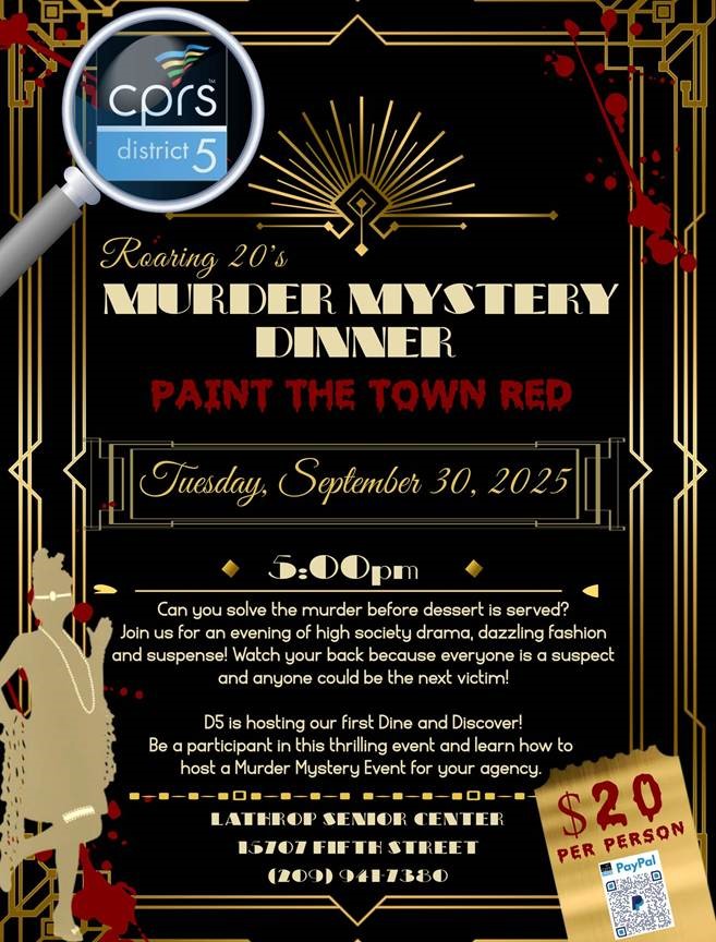 Investigate with fellow D5 members to unravel the murder mystery of the evening! You will not only have a fun filled evening, but you will learn how to host your very own murder mystery activity! Roaring 20's dress is encouraged! Tickets are $20 per person and can be purchased via QR code. Please list your name and what agency you are with upon check out. We hope to see you there! Questions? Call 209-941-7380