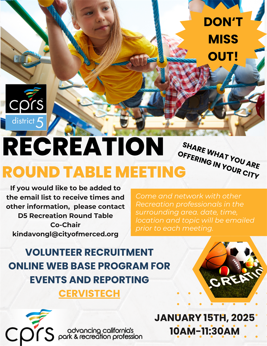 The Recreation Round Table have been rescheduled for next year on January 15th at 10AM. Please save the date! The topic of discussion will be about Volunteer Recruitment and utilizing an online web base program to support in this initiative.