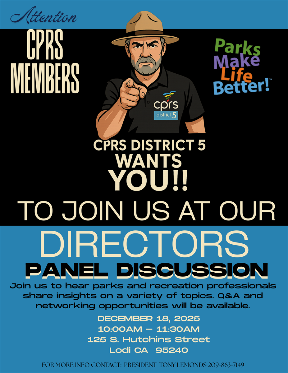 Join us on December 18th for an exciting panel discussion! Listen to four Parks & Recreation Directors from around the Central Valley, speak about their career path, experience in the field of Parks & Recreation and advice on how to grow within our field! This event is free to attend. We hope to see you there!