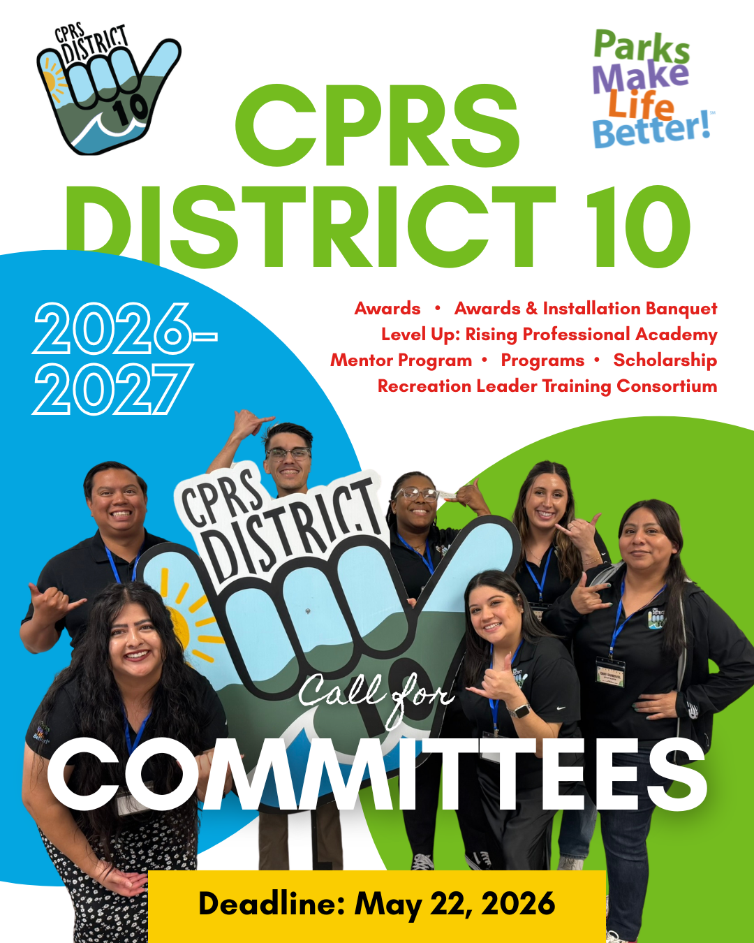 CPRS District 10 is seeking passionate and engaged professionals to serve on a variety of committees for the upcoming year. This is a great opportunity to build your network, develop leadership skills, and contribute to the success of our district and the parks and recreation profession.