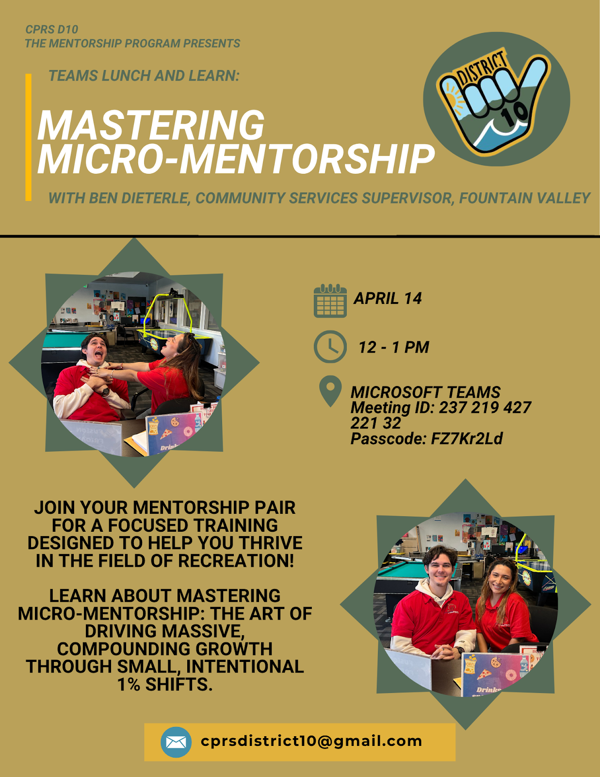 Come join Ben Dieterle, Community Services Supervisor from the City of Fountain Valley, as he goes over Micro-Mentorship: the art of driving massive, compounding growth through small, intentional 1% shifts.