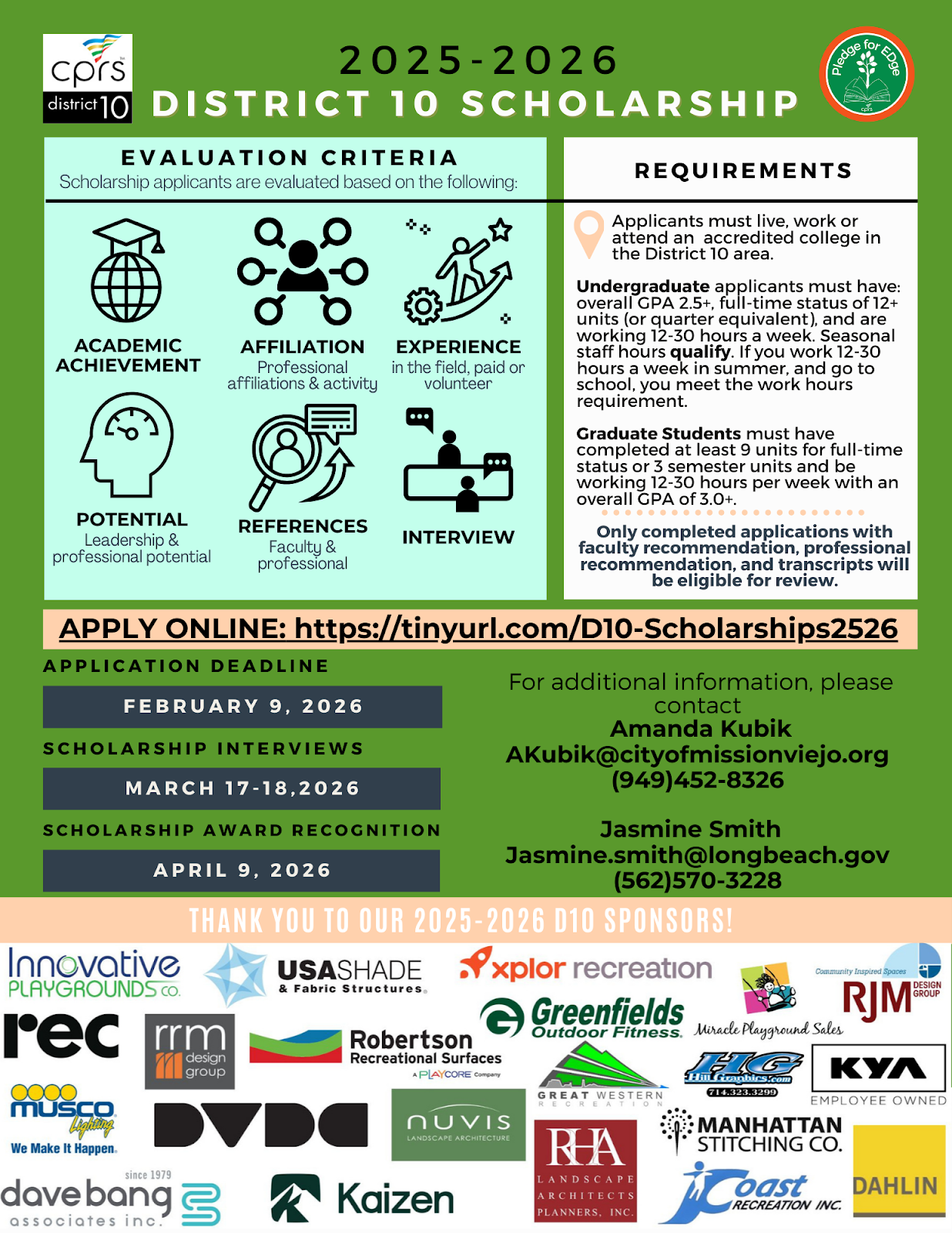 The California Park and Recreation Society (CPRS) District 10 Student Scholarship program is now accepting applications to help cover costs associated with school!