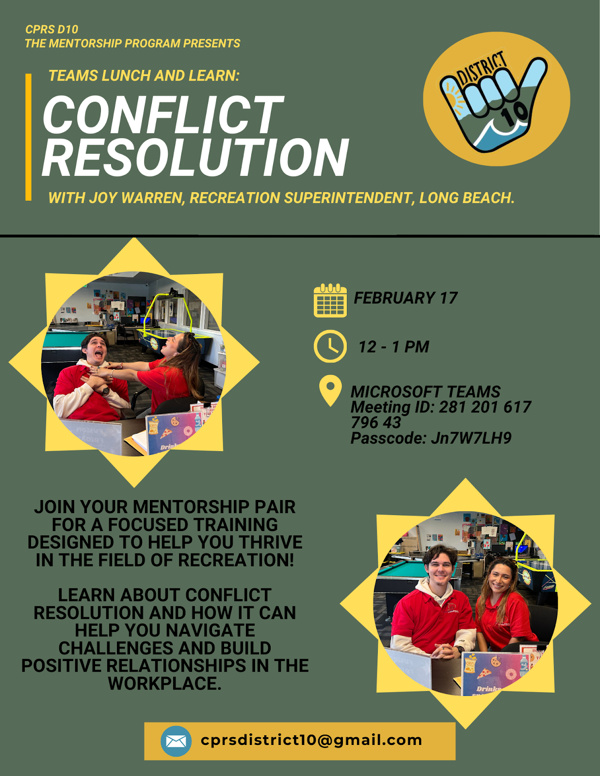 Come join Joy Warren, Recreation Superintendent from the City of Long Beach, as she outlines the various tips and tricks with conflict resolution