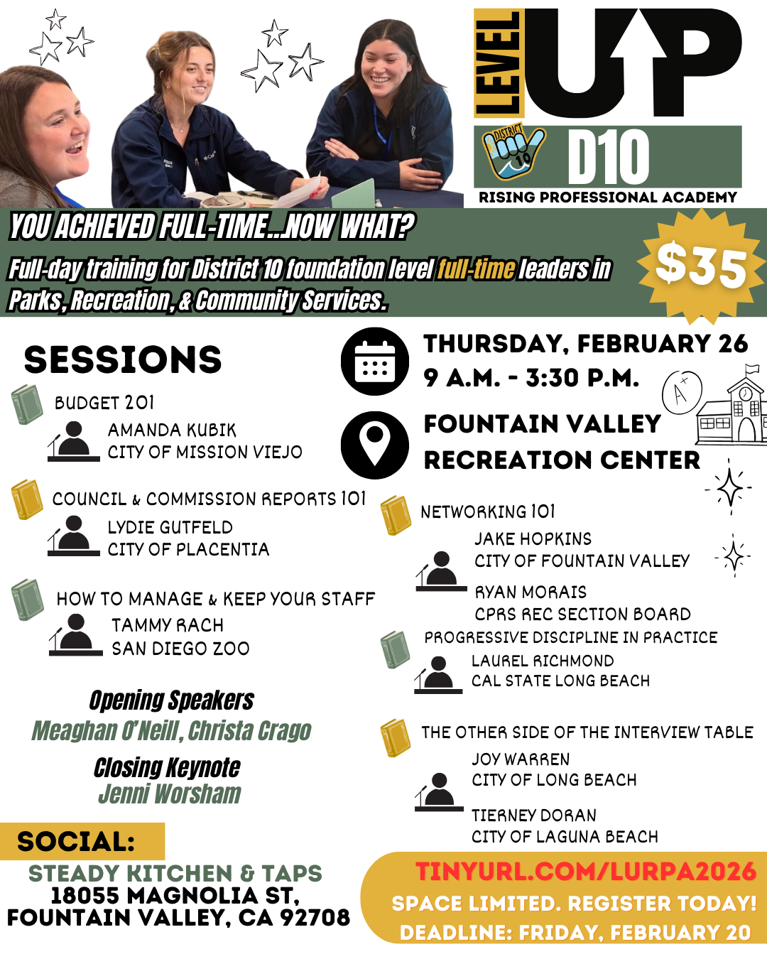 District 10 is excited to be back with a first-of-its-kind full-day training dedicated to emerging full-time leaders in Parks, Recreation, & Community Services. Connect with other D10 professionals to learn and discuss various topics, including budgeting, Council & Commission reports, networking and more!