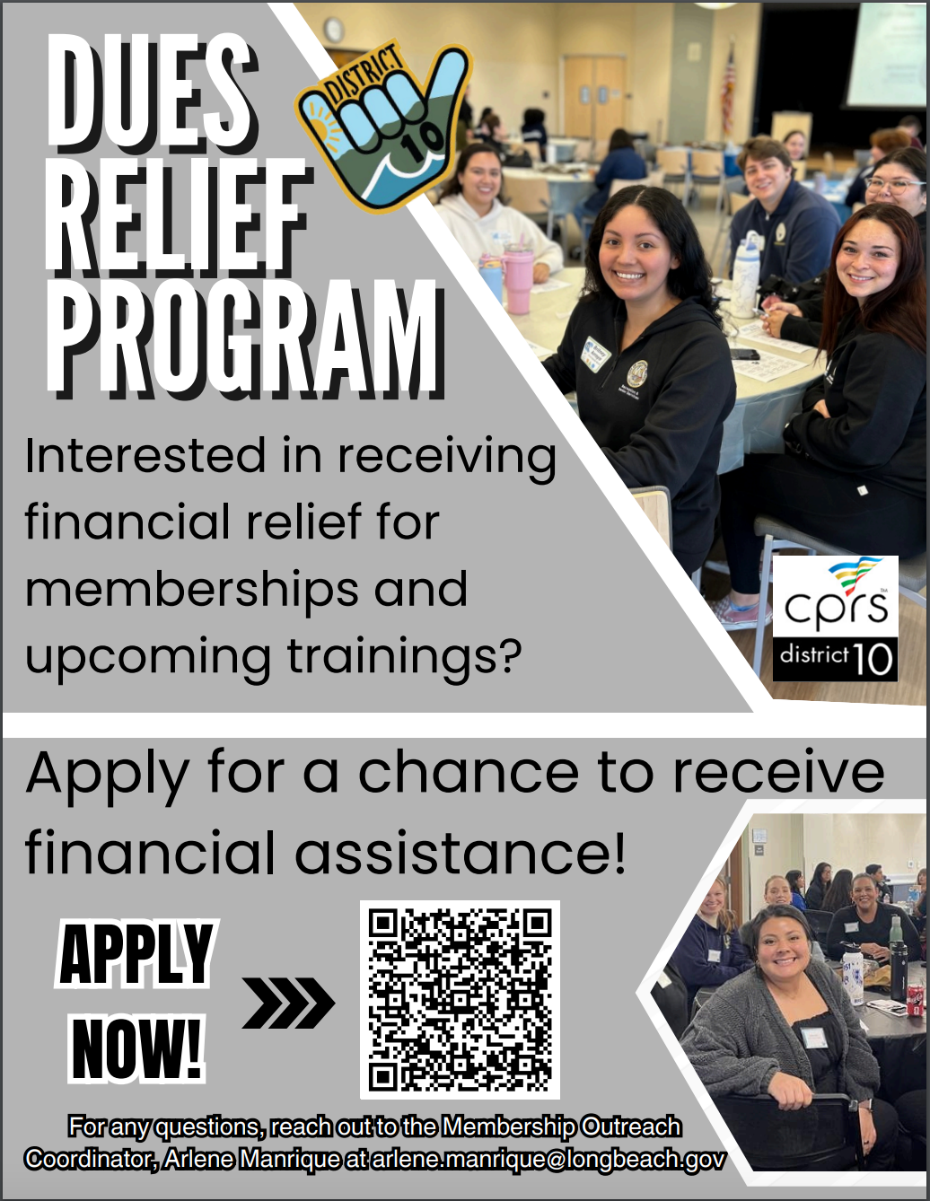 D10 provides Dues Relief to remove a financial barrier that would prevent members from attending events, trainings, and or renewing their membership.
