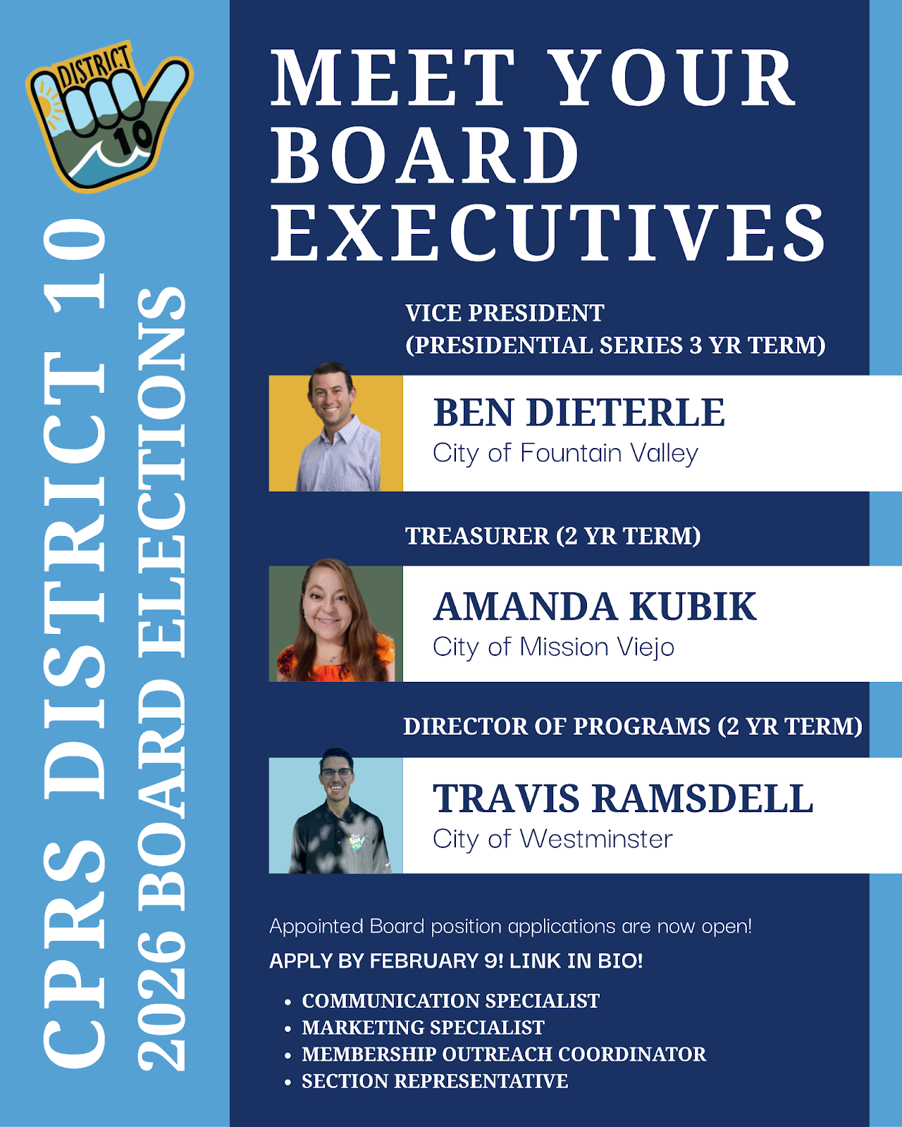 Don't forget to save the date for Thursday, April 9 for our annual Awards and Installation Banquet in the City of Fullerton's Community Center as we celebrate new achievements, highlight award winning District agencies, and welcome the 2026-2027 Board.