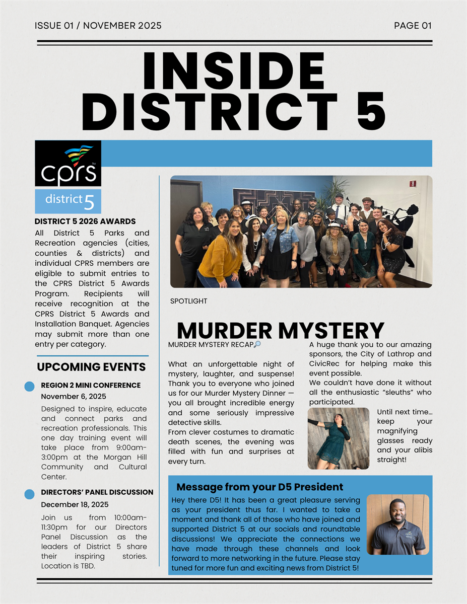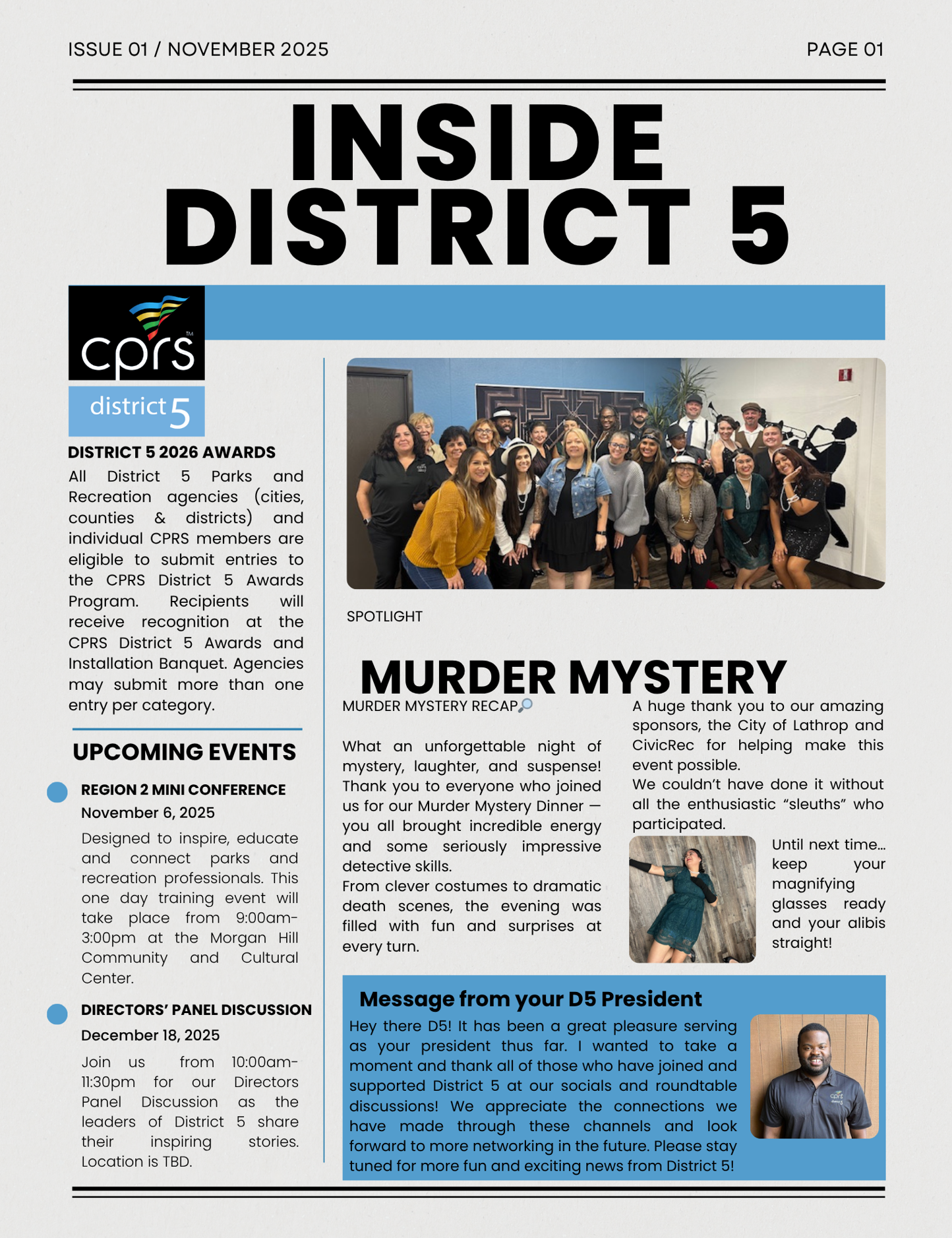 And when is the next general meeting? I'd love to bring my staff and get them more involved. Please use me for a resource as I have been in CPRS for nearly 30 years, have lived in D5 for 23 years and worked for D5 organizations for 18 of those years. It's about time I give back.