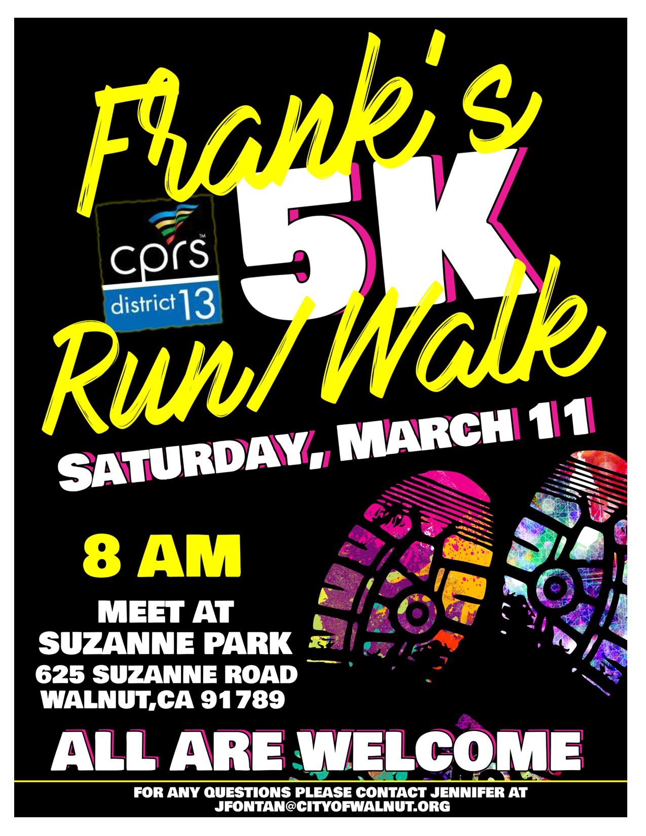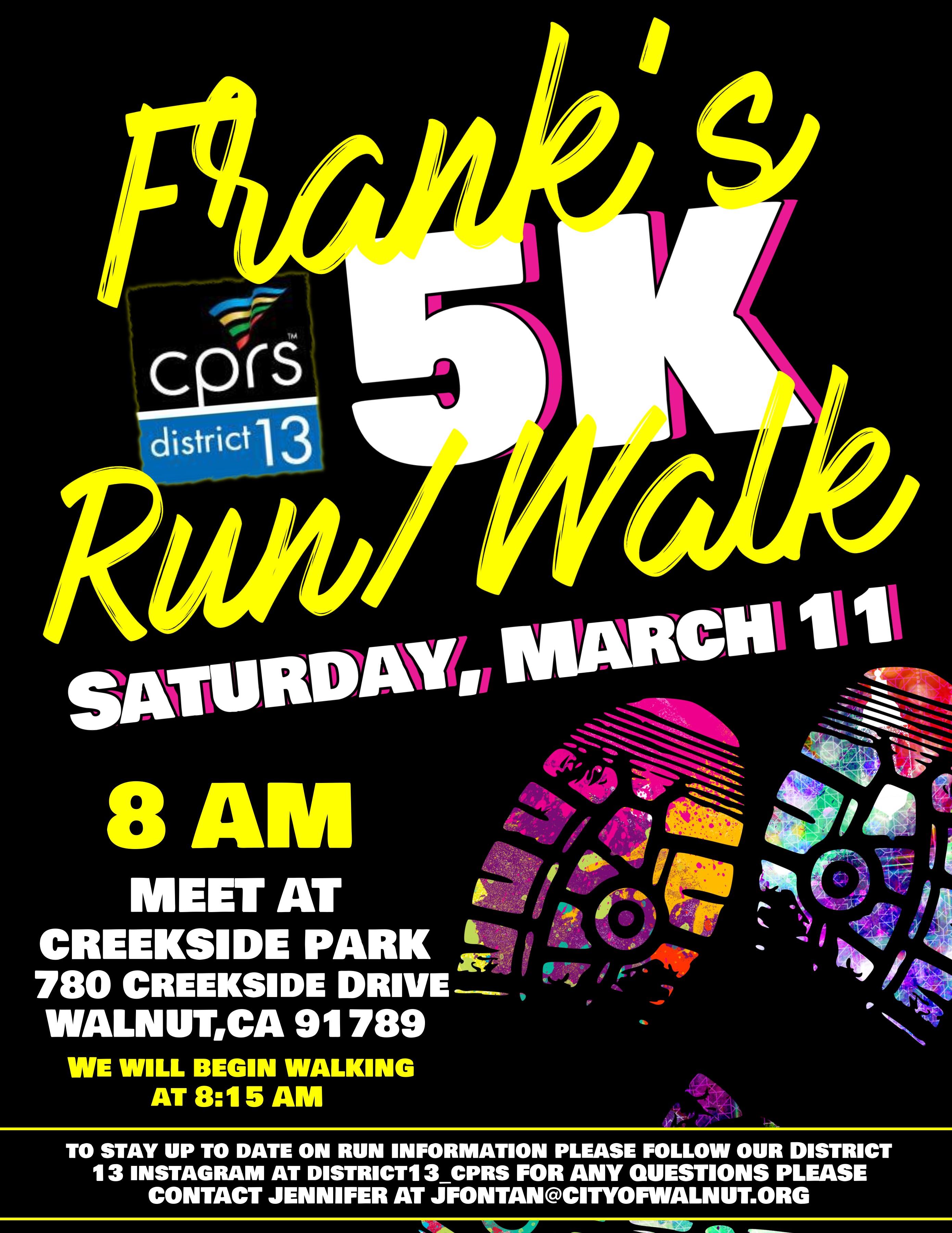 Due to expected rain, the 5K location and route have been adjusted to ensure there will be concrete on the whole trail. If you have any questions or to keep up with information please follow our District 13 Instagram page or email Jennifer at jfontan@cityofwalnut.org.