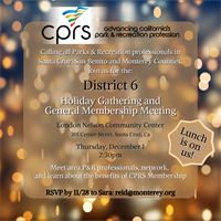 Hello D6! Save the Date for our General Membership Meeting! Please join us for a Holiday Gathering and General Membership Meeting in Santa Cruz on Thursday, December 1. This event is a great opportunity to learn more about the benefits of a CPRS membership while networking with P & R professionals, participating in beneficial discussion groups and kicking off the holiday season!