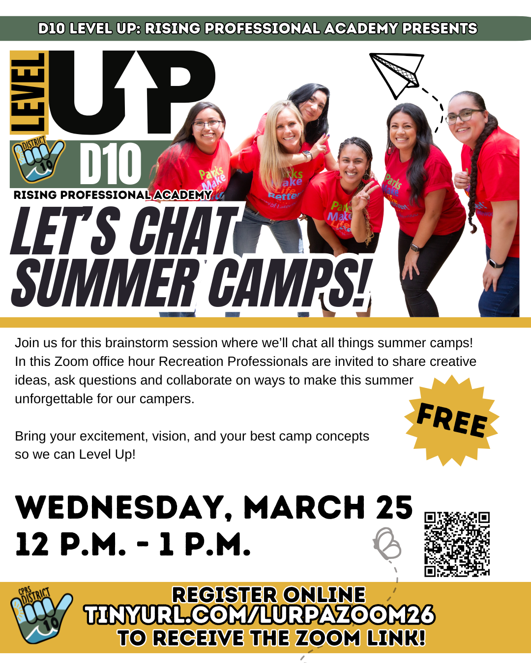 Join the Level Up: Rising Professional Academy in this FREE Zoom Office Hour to chat all things summer camps! Use this session to enjoy a presentation, network and problem solve in a round table & more! Don't miss out on this great opportunity to learn, network, and grow!
