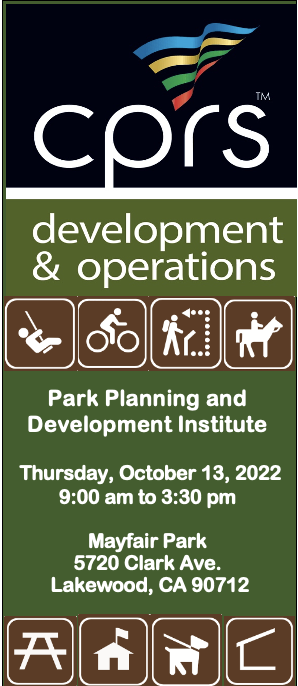 SAVE THE DATE! The CPRS Development & Operations Section will be hosting the Park Planning and Development Institute at Mayfair Park in Lakewood on Thursday, October 13, 2022 from 9:00 am to 3:30 pm. This program will be held in-person and via Zoom with two educational tracks for you to enjoy: Planning and Development hosted by the amazing Tara Gee and Green Parks with Sue Stoffel. More details to come as we finalize program elements!