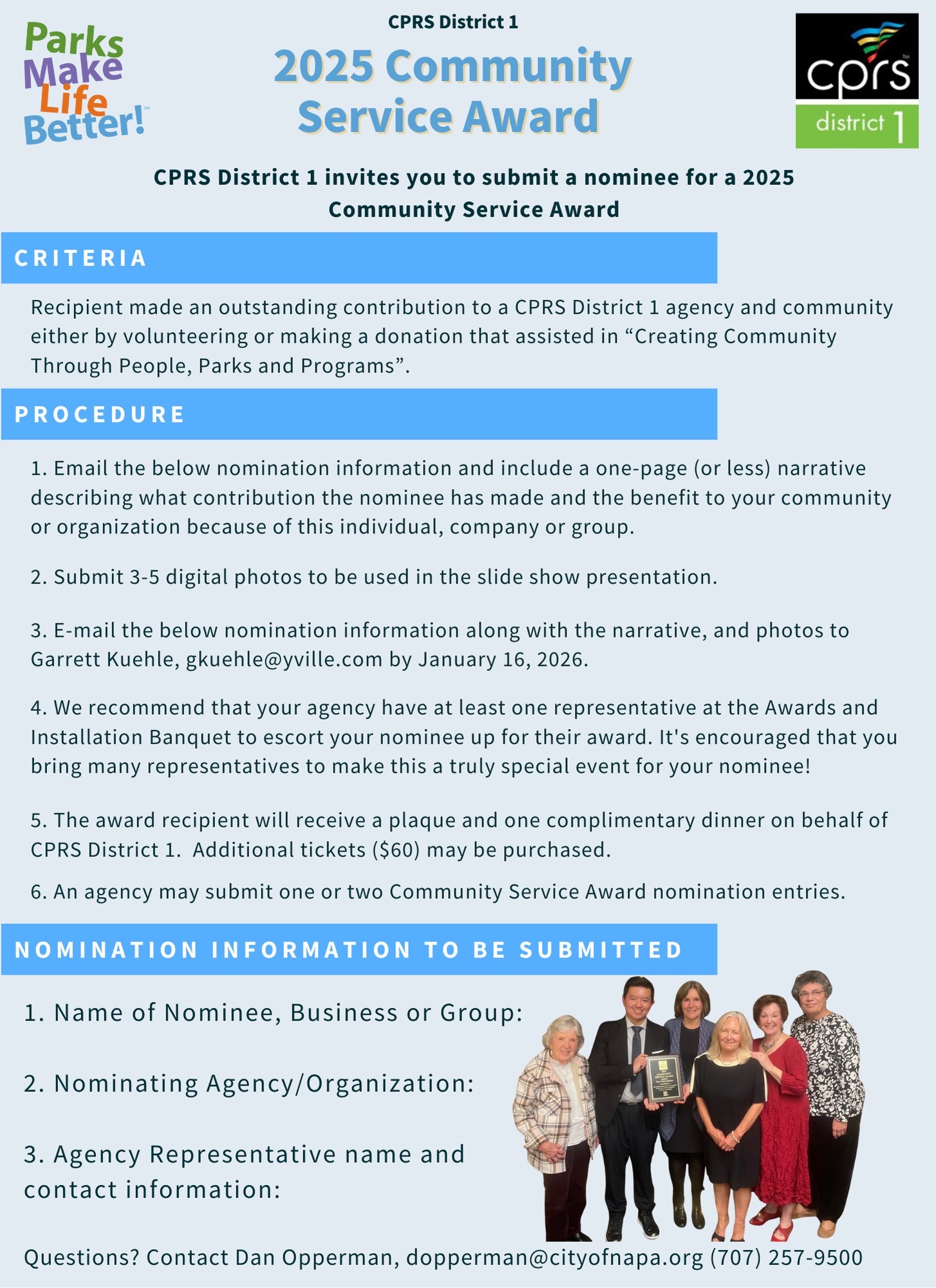The District 1 Board is accepting nominations for the 2025 Community Service Awards and 2025 Professional Award, which will be presented during our Awards Banquet on January 31 in Napa. Please see the attached flyers for criteria and information on the application process. The deadline to submit nominations is Friday, January 16.