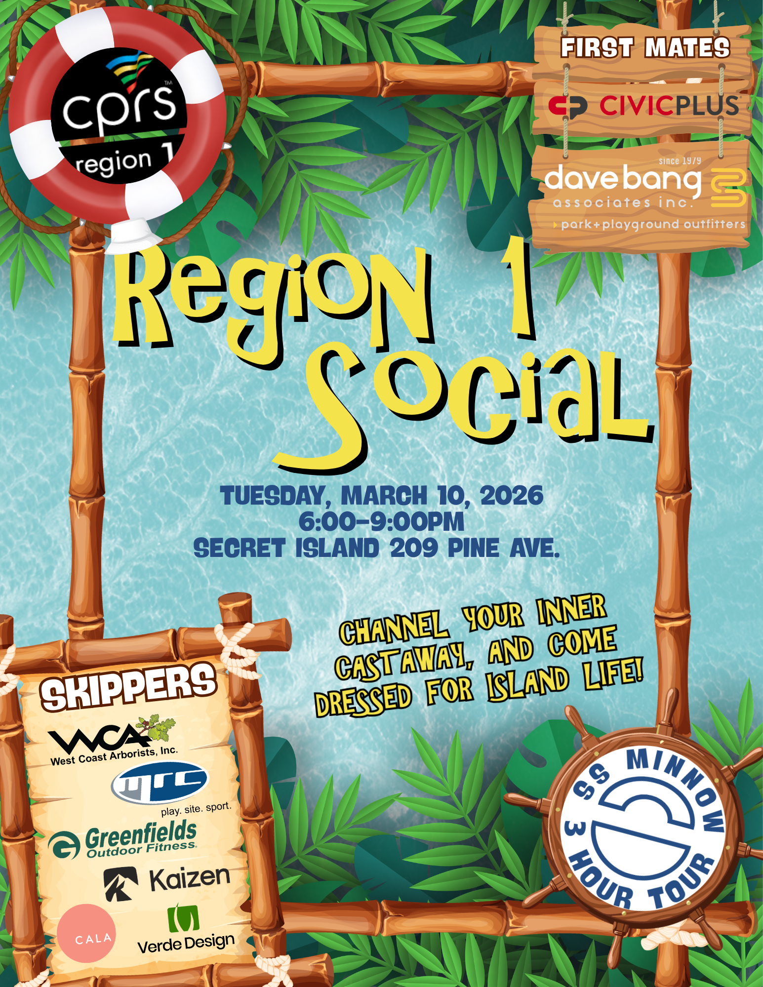 While you are at the CPRS Conference, make sure you do not miss the Region 1 Social, hosted by Districts 1, 2, and 3. On Tuesday, March 10, 2026, from 6:00 to 9:00 PM, we are taking over Secret Island, 209 Pine Ave., and turning it into our very own Gilligan’s Island.