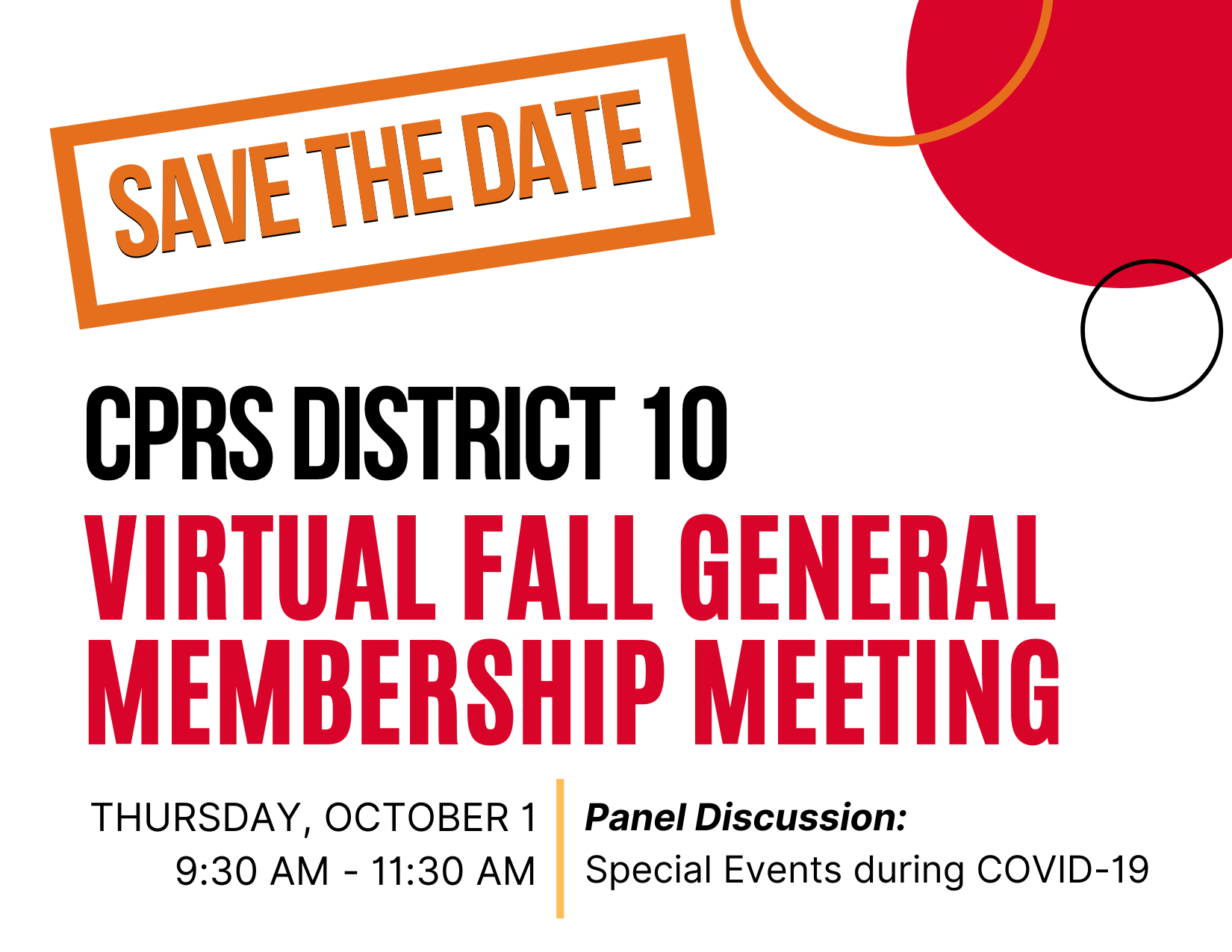 Are you trying to plan a special event during COVID-19? You won't want to miss the Fall General Membership meeting where we will feature speakers who have already planned and executed both in-person and virtual events! Our speakers are excited to share what they learned over the summer and how they will be applying that for the upcoming fall and winter special event season. Register now for the D10 Virtual Fall General Membership meeting on Thursday, October 1, 9:30-11:30am. Free to attend. Deadline to register is September 28th.