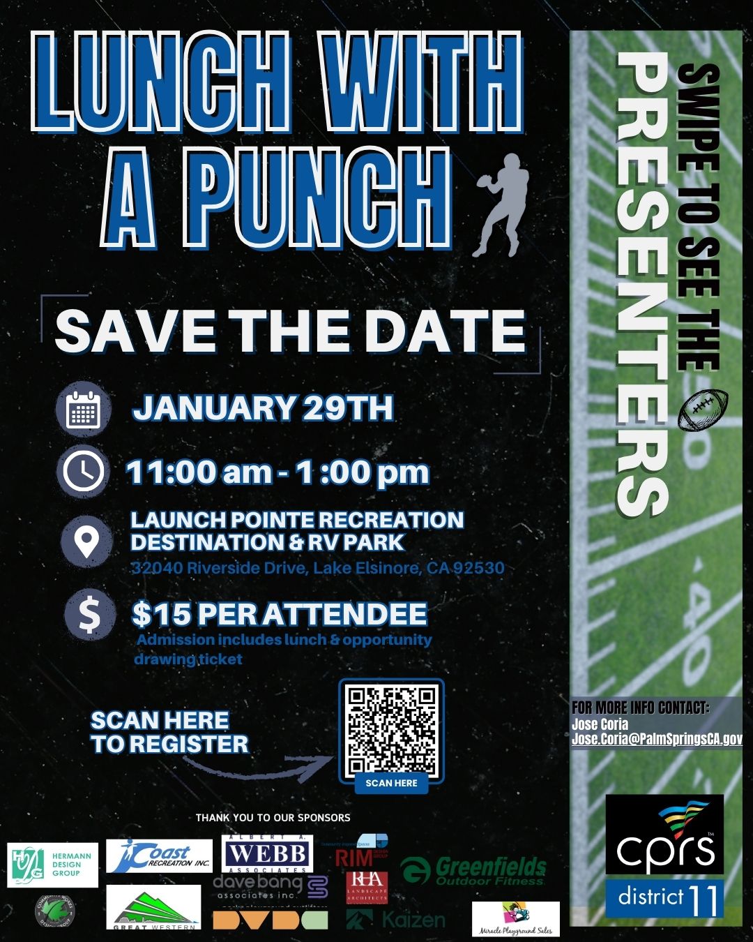 Ready to kick off the next drive in your Recreation Career? Registration for this years Lunch with a Punch is now open!With guest speakers from the City of Temecula, Riverside, and Lake Elsinore. These Recreation Professionals are true veterans of the field and will share the strategies, leadership calls, and lessons that lead to championship-level success.π January 29, 2026π Lake Elsinoreβ° 11:00 a.m. - 1:00 p.m.π $15 per personπ΄ Includes lunch + a chance to score big in our opportunity drawing!The clock is running so call the play and register before time runs out!